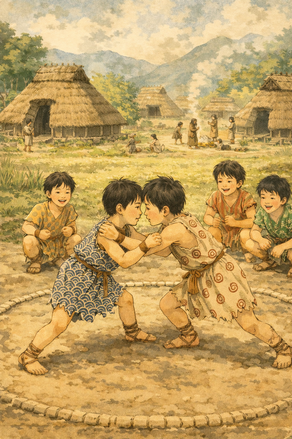 年上の男の子たちは大人の男たちの指示を受けて相撲のための土俵を作っています。土を盛り上げてから、杵でたたいて固めます。何度も繰り返すと、しっかりした立派な土俵になるのです。この土俵から落ちるか、足の裏以外の体を土につけたら負け、という決まりになっています。毎年二回、寒い月と暑い月に近くの村が集まって相撲大会を開きます。男たちの楽しみにしている、祭りのようなものです。今回はフジミ村が大会の場所になっていました。