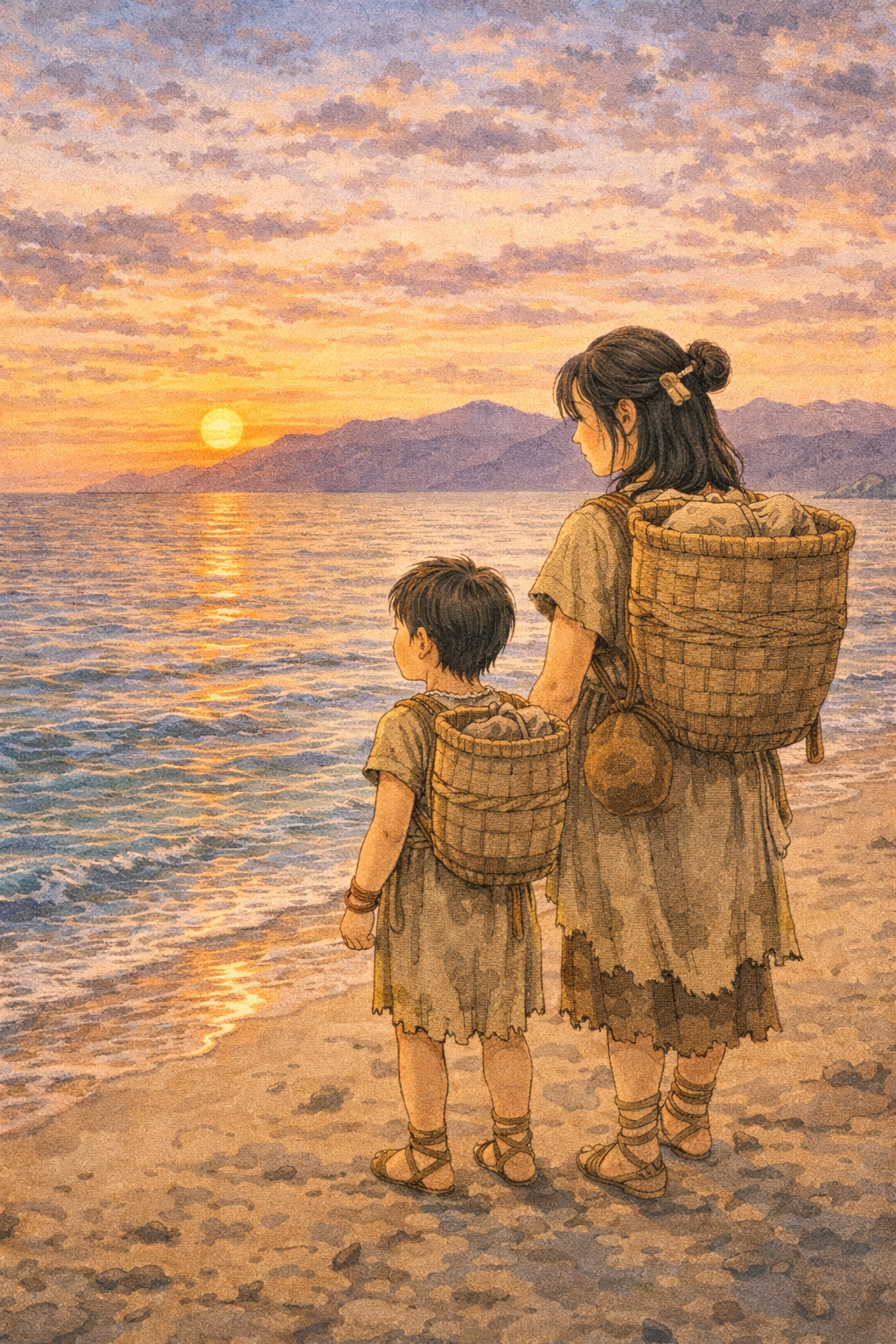 夕方になって海辺の岩の影に火を焚いて眠ることにしました。ユーカおばあさんが持たせてくれた食べ物がいろいろあったので夕飯にそれを食べることにしました。ソランの好物の干し芋と干し柿がたくさんありました。西の空がみかん色に夕焼けを始めました。海風が暖かく吹いています。焚火をしなくても寒くないくらいです。